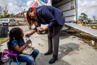 Keisha Holland of the Food Pantry of New Orleans, right, helps London Braggs, 3, with her drink in the 600 block of Perelli Drive Wednesday, Feb. 8, 2017, after a tornado ripped through the neighborhood Tuesday in New Orleans East.