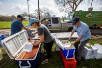 Volunteers with the Food Pantry of New Orleans pass out hot meals and water Wednesday, Feb. 8, 2017, after a tornado ripped through the neighborhood Tuesday in New Orleans East.