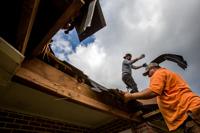 Gobane River, right, rips down damaged shingles as he and a crew make repairs to a roof in the 4700 block of Cerise Street Wednesday, Feb. 8, 2017, after a tornado ripped through the neighborhood Tuesday in New Orleans East.