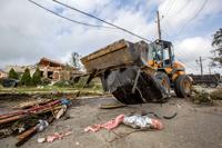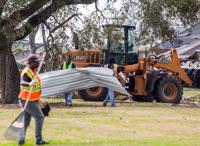 New Orleans sanitation department workers clear Bundy Road Wednesday, Feb. 8, 2017, after a tornado ripped through the New Orleans East neighborhood on Tuesday.