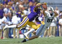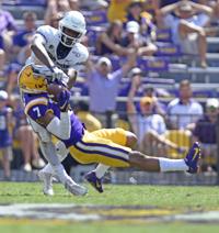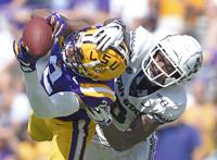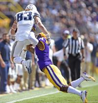 Utah State wide receiver Derek Wright (83) leaps over LSU defensive back Maurice Hampton Jr. (14) on the stop in the second half of the Tigers' 42-6 win over the Aggies, Saturday, October 5, 2019, at LSU's Tiger Stadium in Baton Rouge, La.
