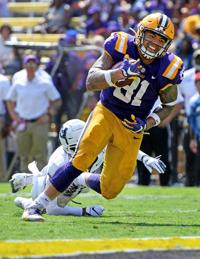 Utah State safety Cash Gilliam (5) can only watch after missing the tackle as LSU tight end Thaddeus Moss (81) scores on the pass play during the second half of LSU's football game against Utah State at Tiger Stadium Saturday Oct. 5, 2019, in Baton Rouge, La.
