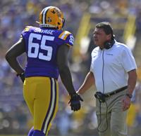 LSU head coach Ed Orgeron, right, celebrats the stopping play of LSU defensive end Neil Farrell Jr. (92) and LSU linebacker Damone Clark (35) during the first half of LSU's football game against Utah State at Tiger Stadium Saturday Oct. 5, 2019, in Baton Rouge, La.
