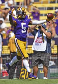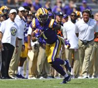 LSU running back John Emery Jr. (4) celebrates after scoring in the first half against Utah State, Saturday, October 5, 2019, at LSU's Tiger Stadium in Baton Rouge, La. Emery's touchdown was called back following a holding penalty on LSU tight end Thaddeus Moss.
