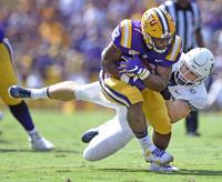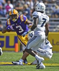 LSU running back Tyrion Davis-Price (3) runs the ball past Utah State safety Sam Lockett (37) in the second half of the Tigers' 42-6 win over the Aggies, Saturday, October 5, 2019, at LSU's Tiger Stadium in Baton Rouge, La.