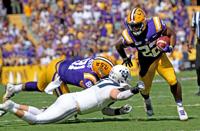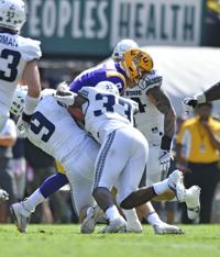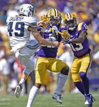 LSU safety Eric Monroe (11) runs into Utah State punter Pierce Callister (49) as LSU wide receiver Jontre Kirklin (13) watces, right, during the first half of LSU's football game against Utah State at Tiger Stadium Saturday Oct. 5, 2019, in Baton Rouge, La.