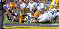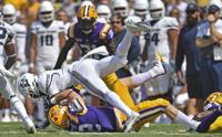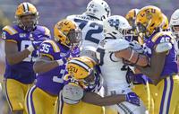 Utah State running back Enoch Nawahine (27) is swarmed by, from left, LSU's defensive end Justin Thomas (93), linebacker Damone Clark (35), defensive lineman Joseph Evans (94) and linebacker Andre Anthony (46) during the second half of LSU's football game against Utah State at Tiger Stadium Saturday Oct. 5, 2019, in Baton Rouge, La. LSU won 42-6.