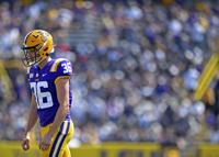 LSU place kicker Cade York (36) gives it a little body english to no avail as everybody watches the long field goal go wide late in the second half of LSU's football game against Utah State at Tiger Stadium Saturday Oct. 5, 2019, in Baton Rouge, La. LSU won 42-6.