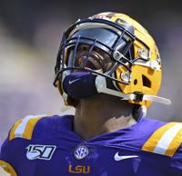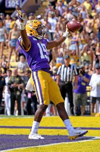 LSU wide receiver Justin Jefferson (2) looks at his hands after making a circus catch for a first down as LSU wide receiver Ja'Marr Chase (1) comes up to celebrate the catch during the first half of LSU's football game against Utah State at Tiger Stadium Saturday Oct. 5, 2019, in Baton Rouge, La.