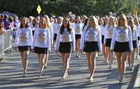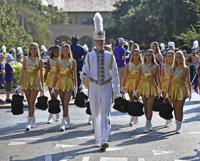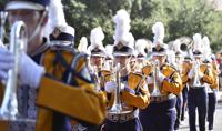 LSU's Golden Band From Tiger Land plays the fight songin a blur of motion while coming down Victory Hill before the first half of LSU's football game against Utah State at Tiger Stadium Saturday Oct. 5, 2019, in Baton Rouge, La.