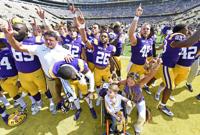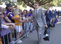 Colton Moore, 9, and Kelly Orgeron hold up an LSU sign as LSU head coach Ed Orgeron sings the alma mater with his players after the second half of LSU's football game against Utah State at Tiger Stadium Saturday Oct. 5, 2019, in Baton Rouge, La. LSU won 42-6.