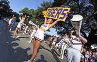LSU's Mike the Tiger fires up the fans before the Golden Band From Tiger Land comes down Victory Hill before the first half of LSU's football game against Utah State at Tiger Stadium Saturday Oct. 5, 2019, in Baton Rouge, La.