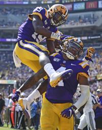 LSU wide receiver Justin Jefferson (2) celebrates with LSU running back Clyde Edwards-Helaire (22) after scoring in the second half of the Tigers' 42-6 win over the Aggies, Saturday, October 5, 2019, at LSU's Tiger Stadium in Baton Rouge, La.