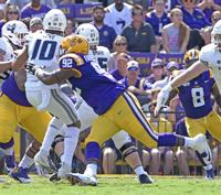 LSU defensive end Neil Farrell Jr. (92) makes the sack tackle on Utah State quarterback Jordan Love (10) for a loss during the first half of LSU's football game against Utah State at Tiger Stadium Saturday Oct. 5, 2019, in Baton Rouge, La.