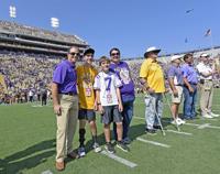 Scott Wester, President and CEO of OLOL, left, is at midfield with Dayton Suire, 15, and Drake Suire, 13, for the pre-game coin flip before the first half of LSU's football game against Utah State at Tiger Stadium Saturday Oct. 5, 2019, in Baton Rouge, La.