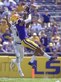 LSU wide receiver Justin Jefferson (2) pulls in a touchdown pass in front of Utah State cornerback DJ Williams (7) during the second half of LSU's football game against Utah State at Tiger Stadium Saturday Oct. 5, 2019, in Baton Rouge, La. LSU won 42-6.